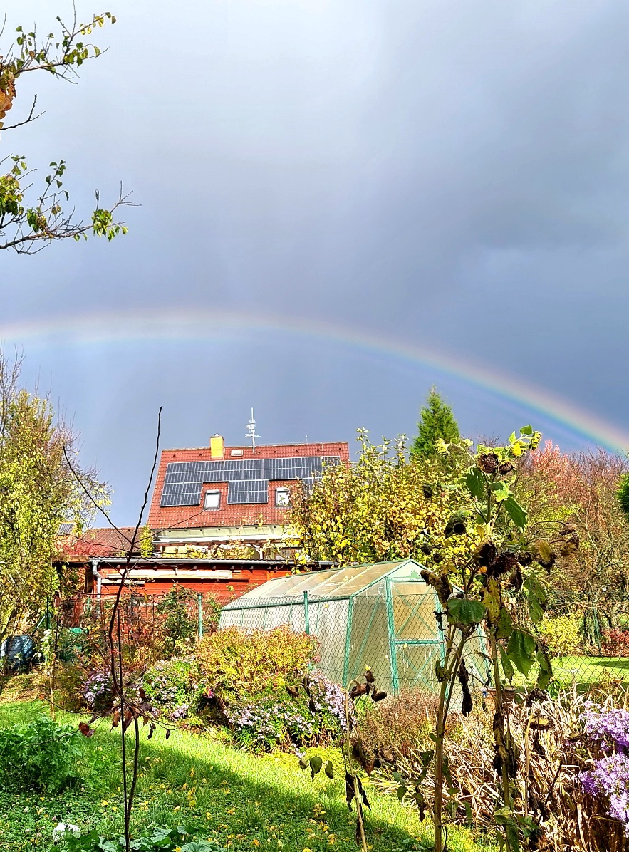 Na nedělní nízké odpolední duze bylo zajímavé vytvoření podružných duhových oblouků při jejím pravém okraji, ale hlavně zdvojení části hlavní duhy ve vrcholu duhového oblouku, způsobené patrně rozdílnými velikostmi dešťových kapek, které se na vzniku optického úkazu podílely (13:53 SEČ, mobil, komprimace, zvýšení kontrastu).