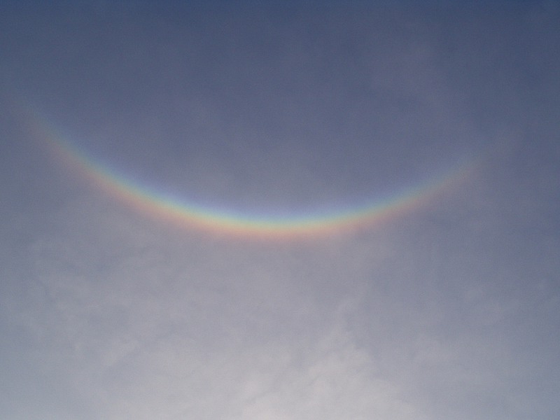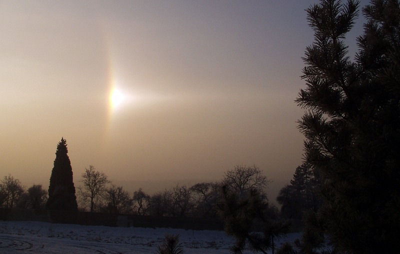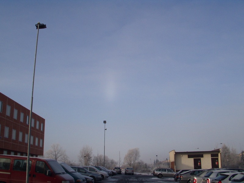 Halové jevy na krystalcích v přízemní atmosféře (diamantový prach) - jasná vedlejší slunce (parhelia), cirkumzenitální oblouk, 120° vedlejší slunce (paranthelia) a části parhelického kruhu.