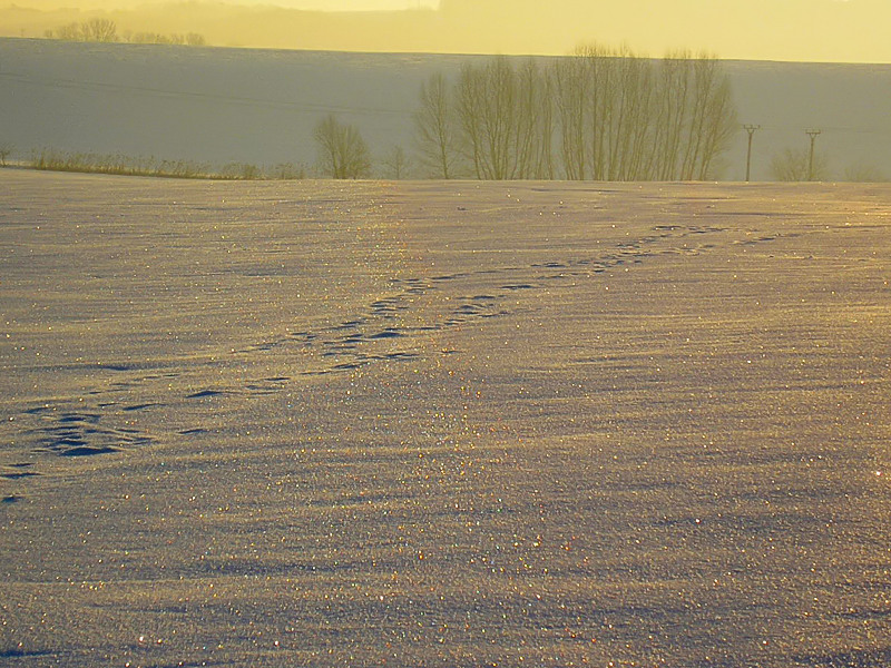 Slabý halový jev na sněhové pokrývce. Jde o 22° halo, které je vlastně obdobou toho, které lze spatřit na obloze. Použitý přístroj: Olymus Camedia C-310.