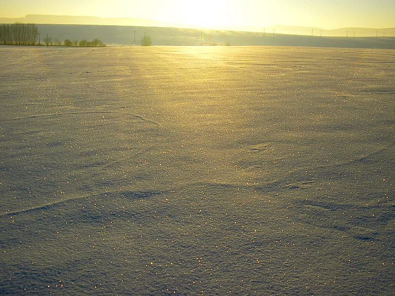 Slabý halový jev na sněhové pokrývce. Jde o 22° halo, které je vlastně obdobou toho, které lze spatřit na obloze.