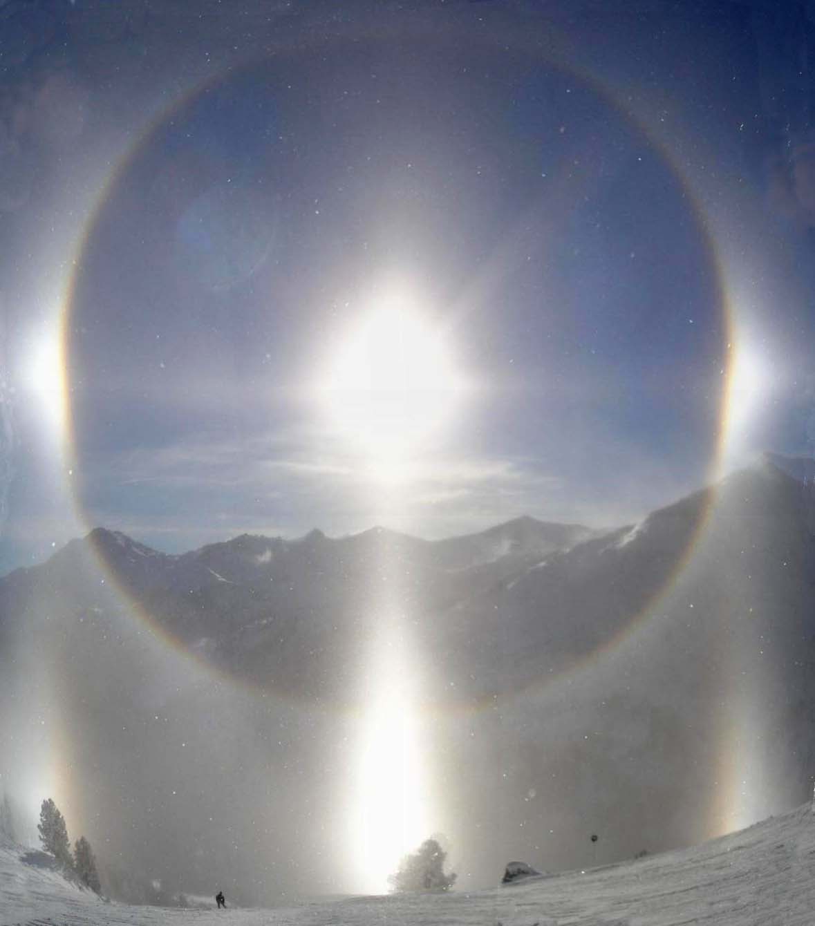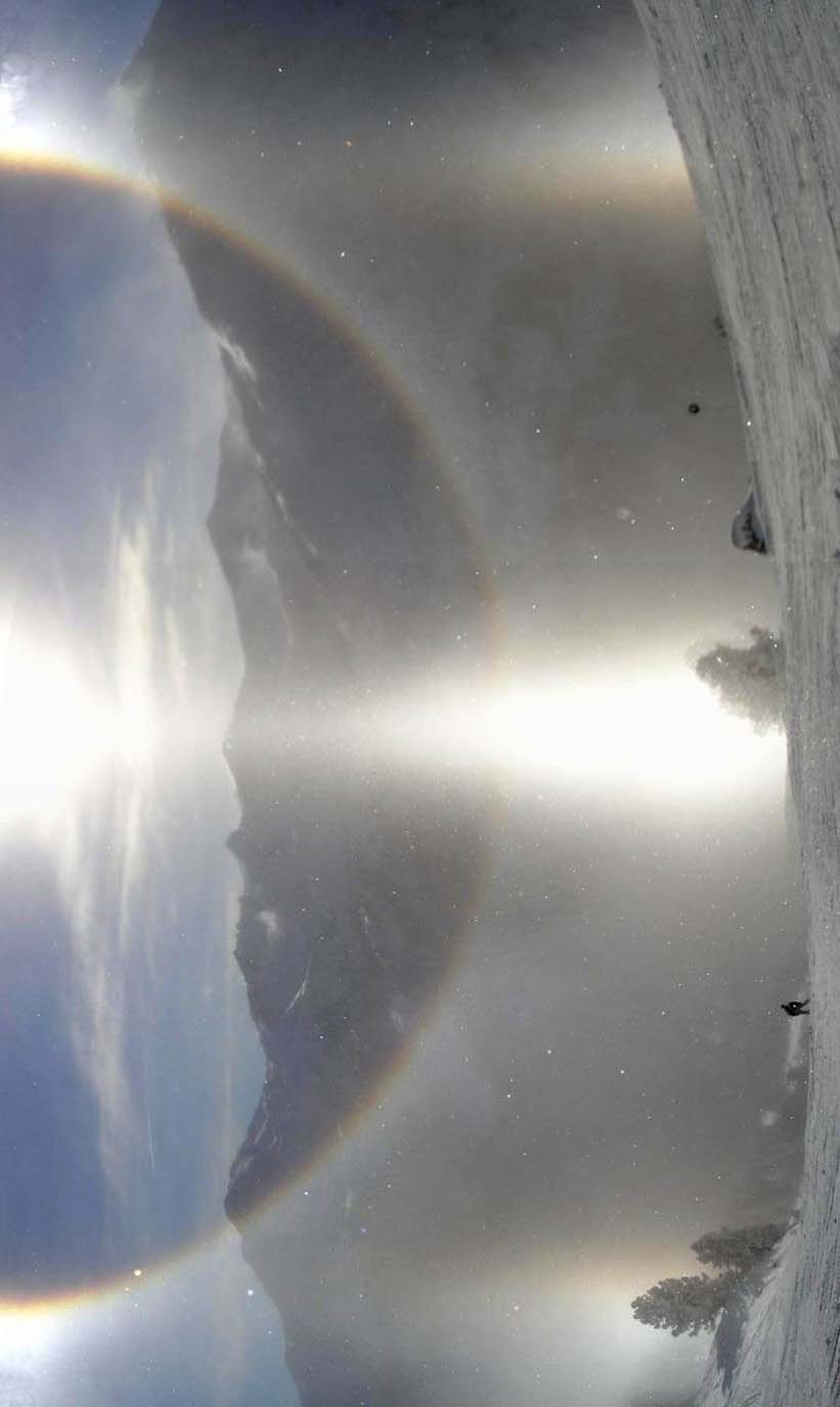 Zářivě jasný úkaz v ledových krystalcích v přízemní vrstvě ovzduší. Pozorováno bylo jasné halo, parhelia, spodní parhelia + cirkumzenitální oblouk. Polojasno, teplota kolem -5 °C, ve vzduchu ledové krystaly, okolo 14 h, trvání jevu asi 15 minut; složená fotografie. Foto Marie Hlaváčová, Jana Vogelová.