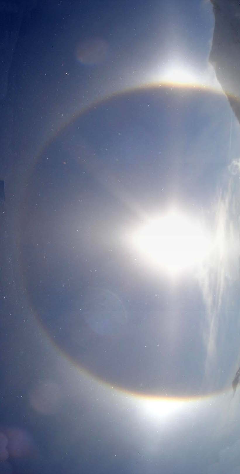Pozorováno to, co je na fotografiích + cirkumzenitální oblouk. Polojasno, teplota kolem -5 °C, ve vzduchu ledové krystaly, okolo 14 h, trvání jevu asi 15 minut.
