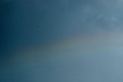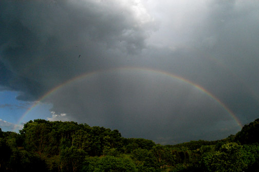 This is the second of two rainbows to appear in one day. Notice the wheel spokes inside the bow and the second one shows primary bow in front of the hill and the last shows an unusual twinned primary caused by droplets flattened by air resistance.